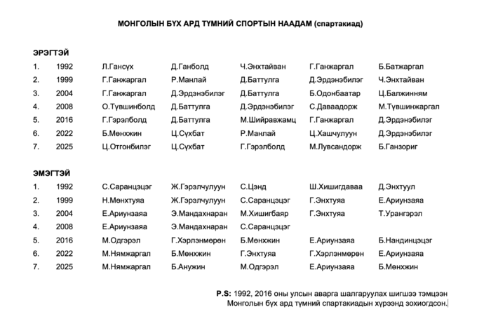 Баянхонгор аймагт зохиогдсон Монголын бүх ард түмний спортын XVI их наадмын 100 буудалт даамын шигшээ тэмцээний ялагчаар М.Нямжаргал (БГД), Ц.Отгонбилэг (ХУД) нар тодорсон тухай өмнө нь мэдээлсэн билээ. Их мастер Нямжаргалын хувьд сүүлийн хоёр наадамд дараалан аваргалаад байна. Харин цөөнгүй жилийг хилийн чанадад өнгөрүүлсэн Олон улсын мастер Отгонбилэг Улаанбаатар хотын АШТ, дэлхийн аварга Г.Дэлгэрмаагийн нэрэмжит дааганы шагналтай тэмцээн, насанд хүрэгчдийн УАШТ, спартакиад зэрэг энэ жилийн гол тэмцээнүүдэд түрүүлээд байгаа юм. Ингээд тус наадмын медальт болон шагналт байранд шалгарч байсан тамирчдыг танилцулъя.